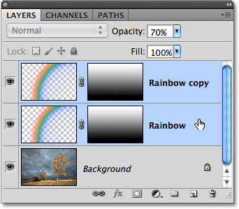 When you see a highlight bar appear around the second rainbow's layer (shown in the previous thumbnail), release your mouse button. Photoshop copies the layer mask onto the second rainbow's layer: